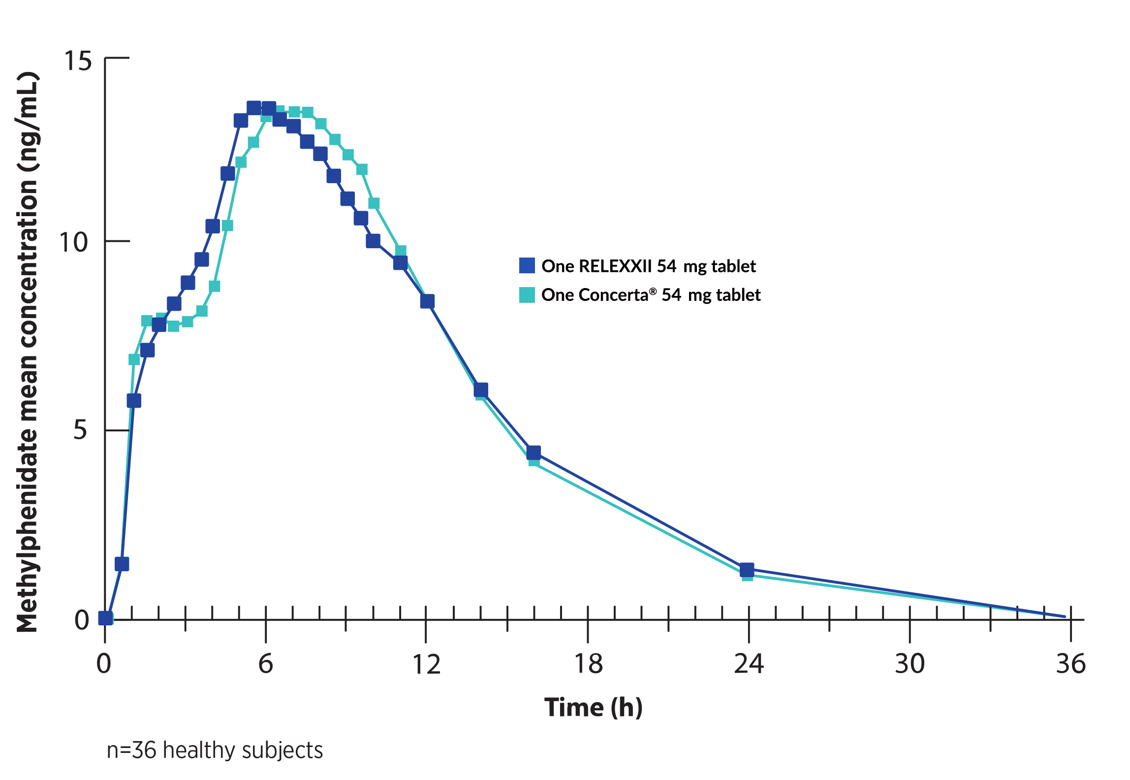 One RELEXXII 54 mg tablet has demonstrated bioequivalence to one Concerta® 54 mg tablet, including in the critical 7–12 hour post-dose window.1-3